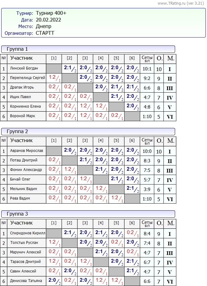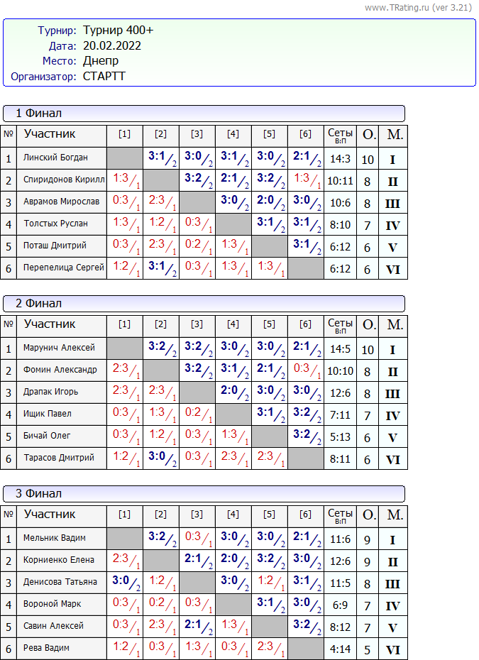 Результаты Турнира “Выходного Дня 400+” за 20.02.2022