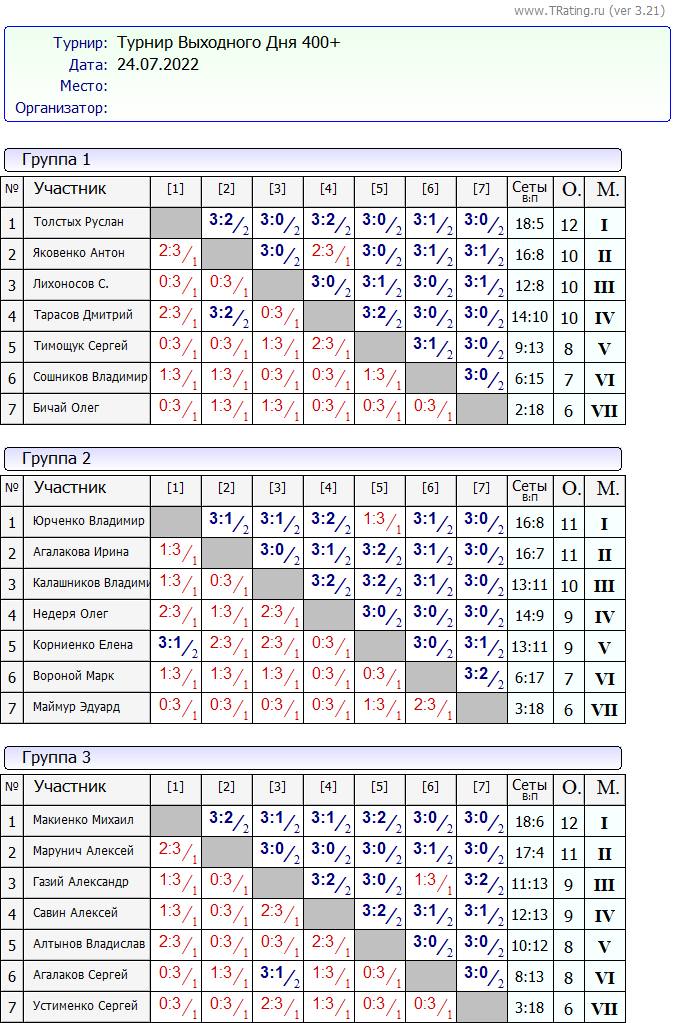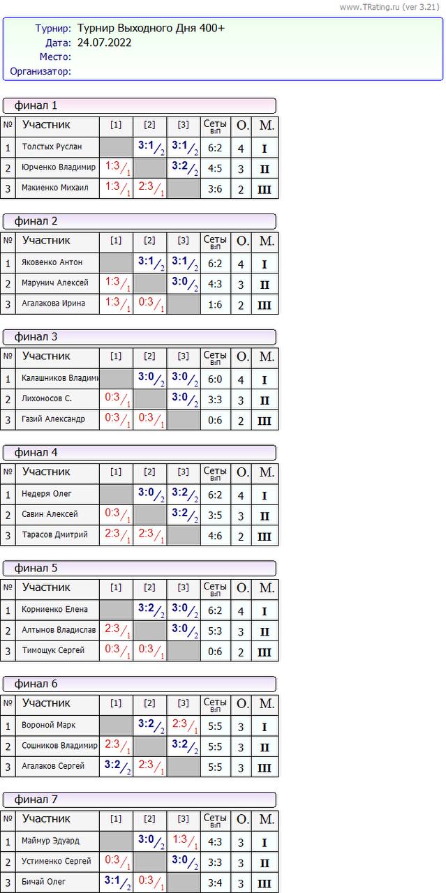 Результати турніру “Вихідного дня 400+ ” за 24.07.2022
