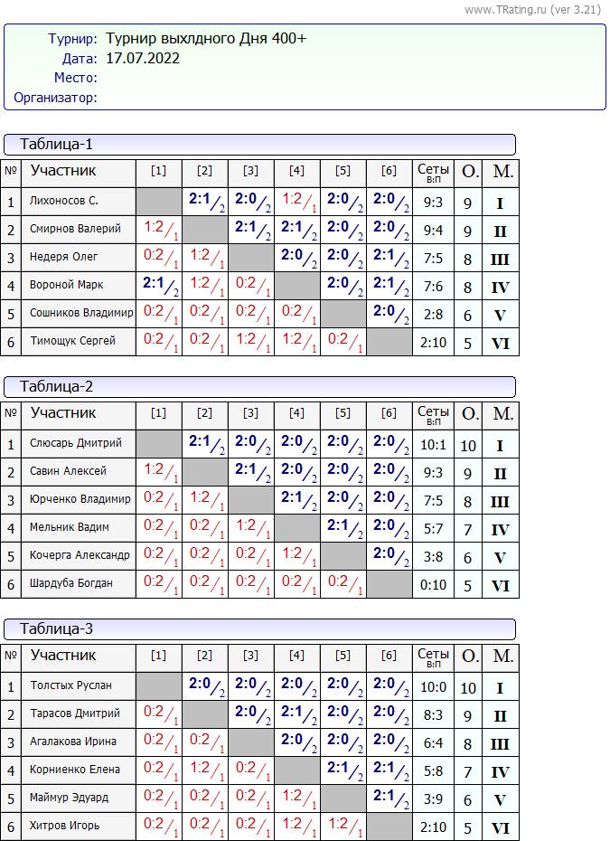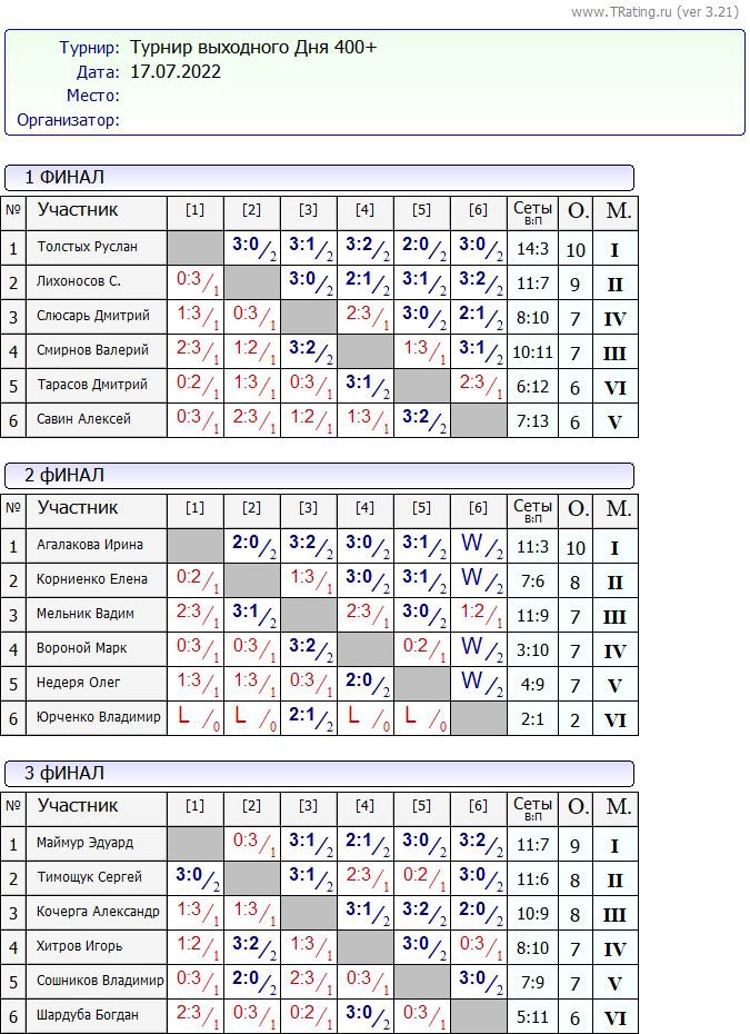 Результати турніру “Вихідного дня 400+ ” за 17.07.2022