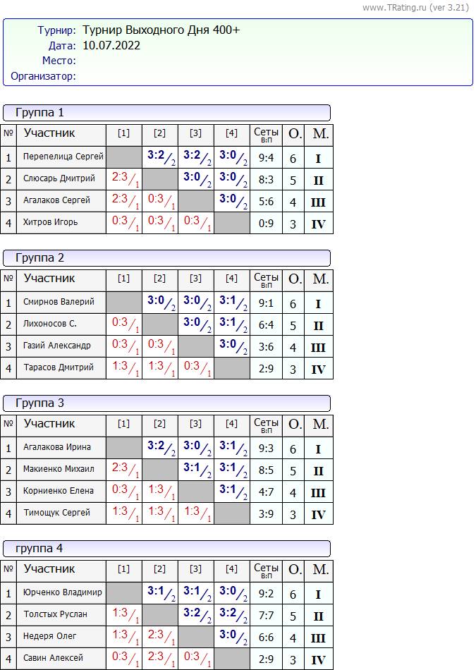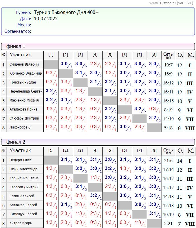 Результати турніру “Вихідного дня 400+ ” за 10.07.2022