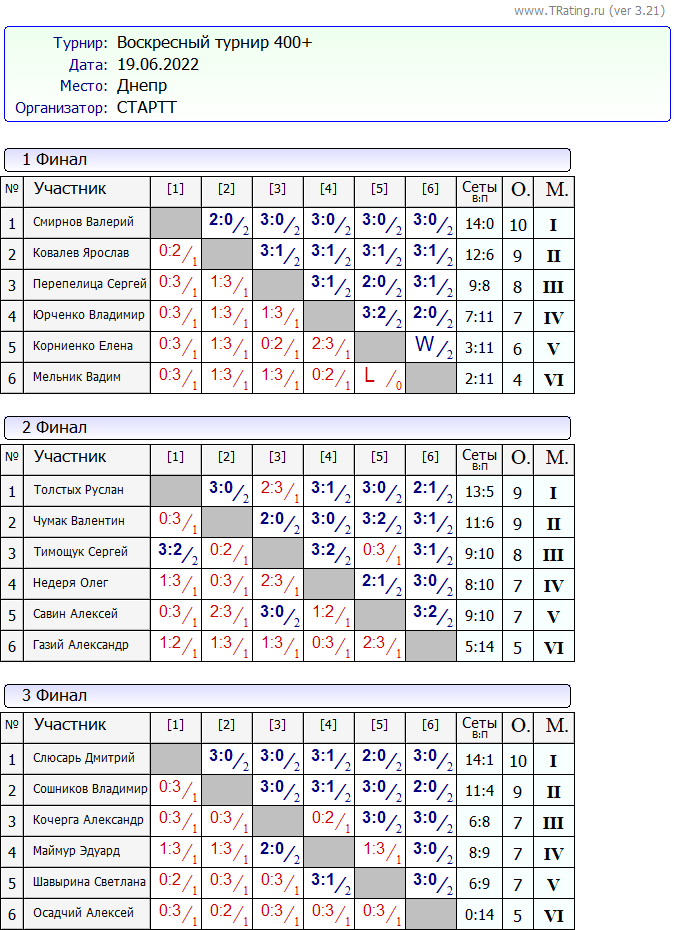 Результаты Турнира “Выходного Дня 400+” за 19.06.2022