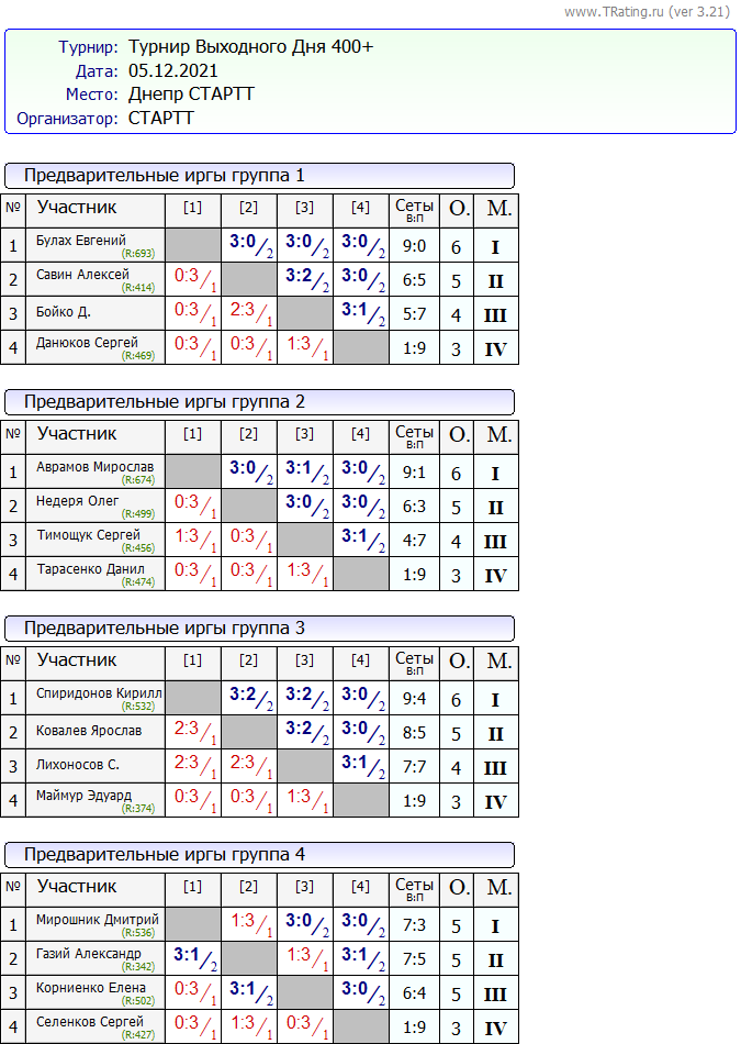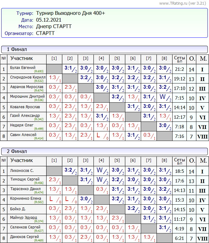 Результаты Турнира “Выходного Дня” 400+ за 05.12.2021