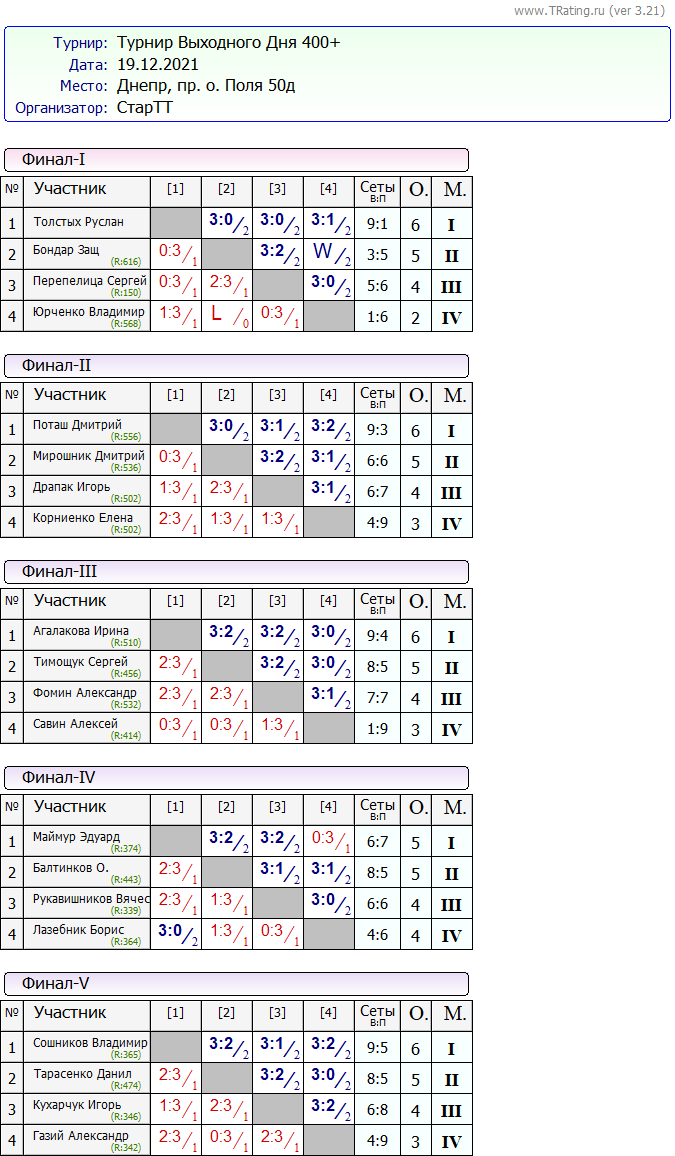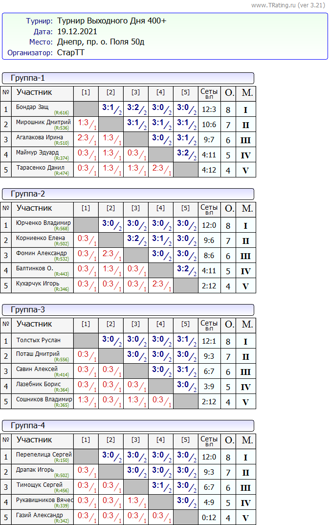 Результаты Турнира “Выходного Дня” 400+ за 19.12.2021
