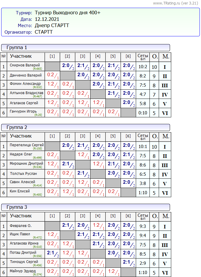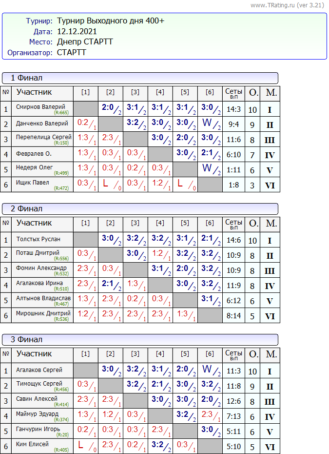 Результаты Турнира “Выходного Дня” 400+ за 12.12.2021