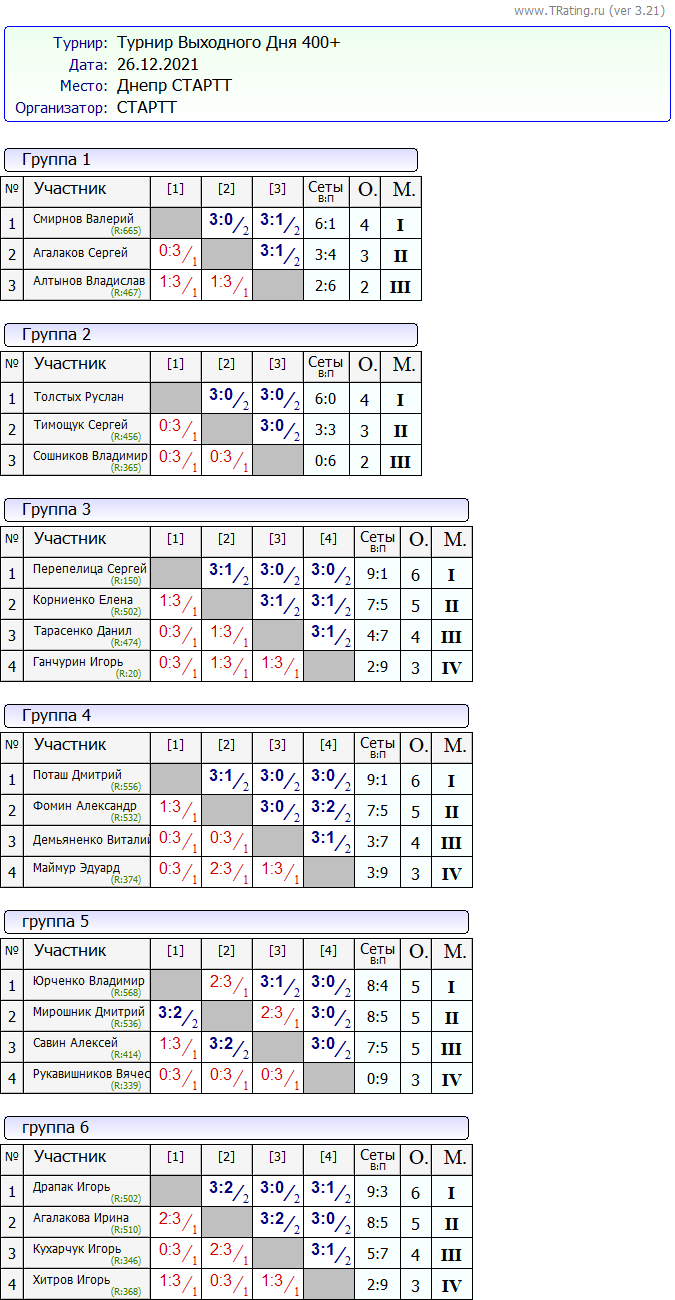 Результаты Турнира “Выходного Дня” 400+ за 26.12.2021