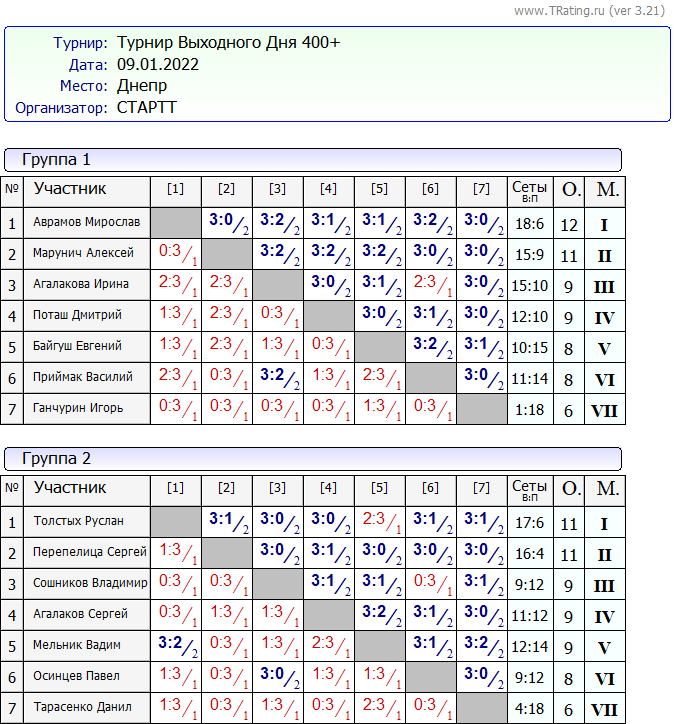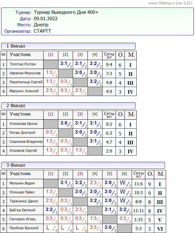 Результаты Турнира “Выходного Дня 400+” за 09.01.2022