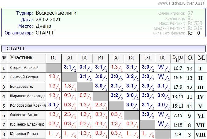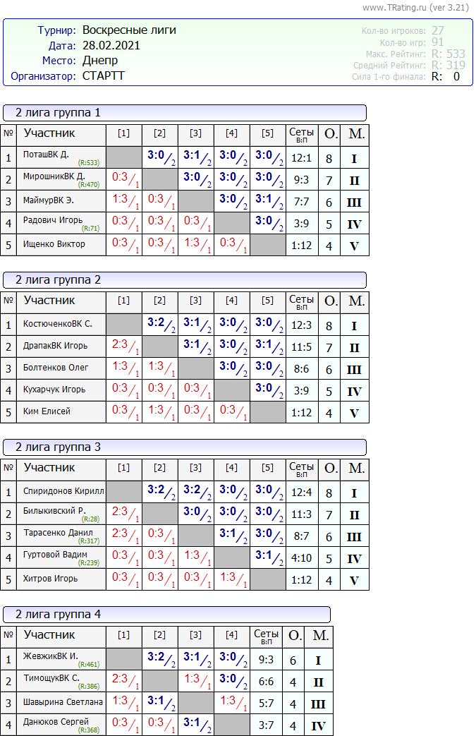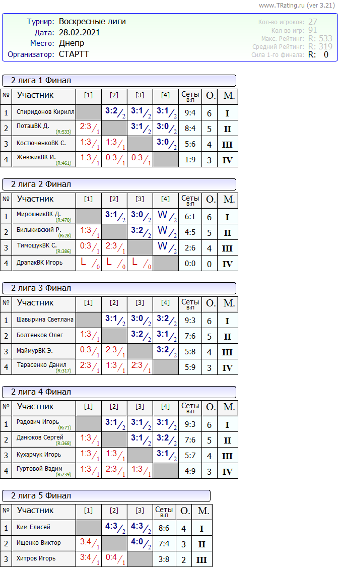 Результаты Воскресные лиги 28.02.2021