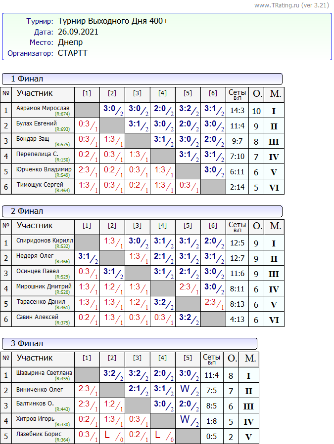 Результаты турнира “Выходного дня” 25 – 26.09.2021