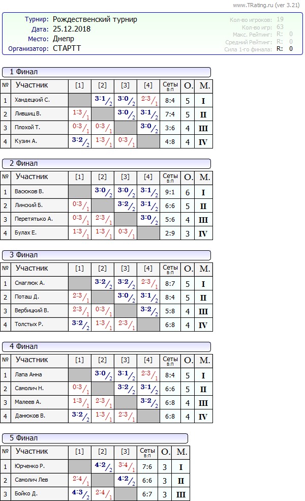 Результаты Рождественского турнира от 25.12.2018г
