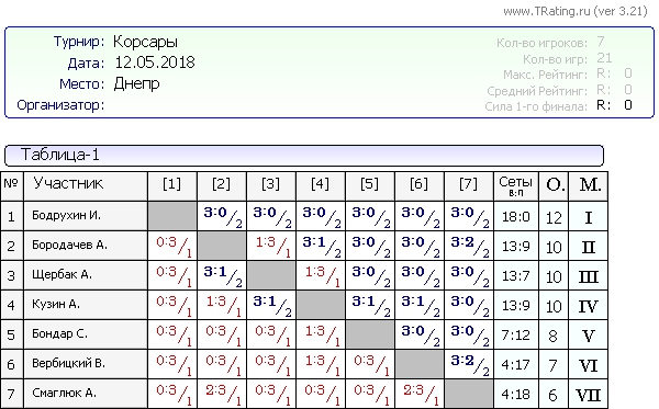 Вашему вниманию результаты турнира Корсары 12.05.2018 года