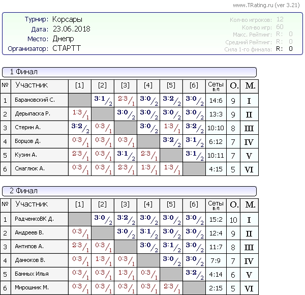Вашему вниманию результаты турнира Корсары 23.06.2018 года