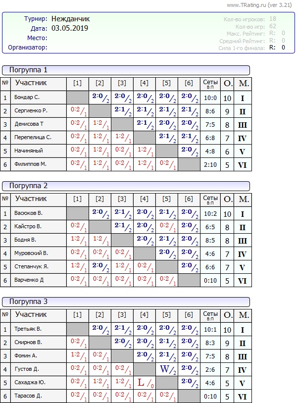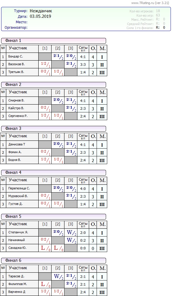 Результаты турнира Нежданчик от 03.05.2019 года