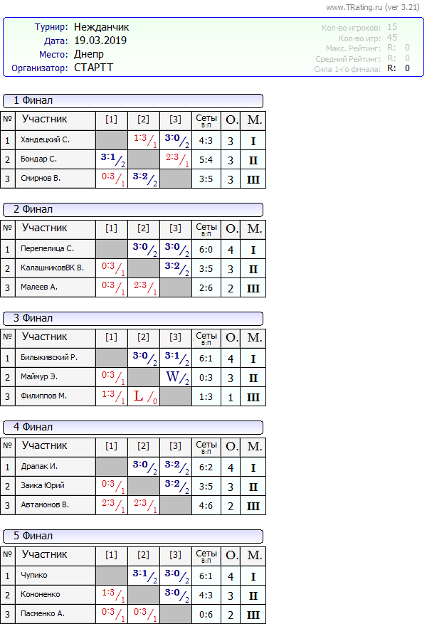 Результаты турнира Нежданчик от 19.03.2019г.