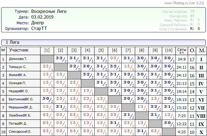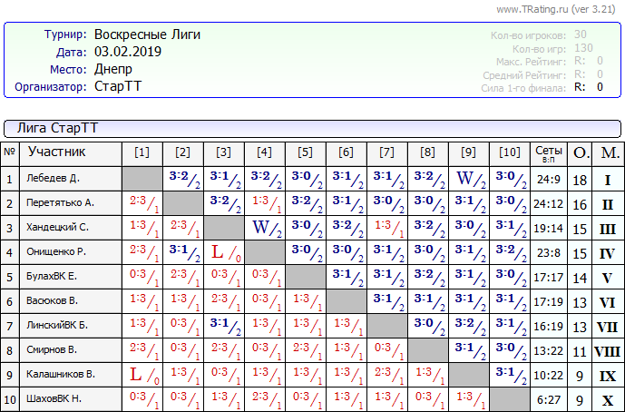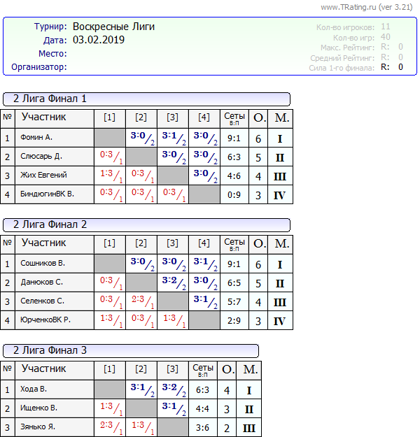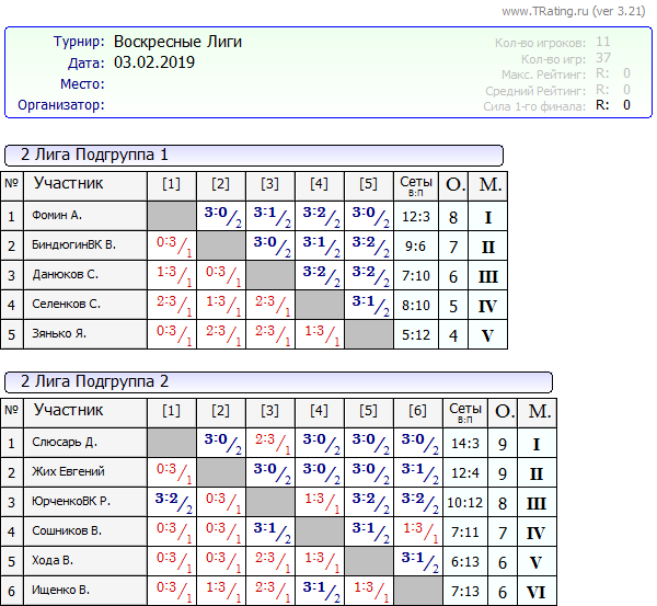 Результаты Воскресных лиг от 03.02.2019г