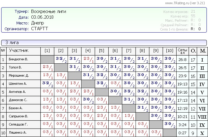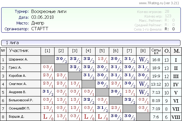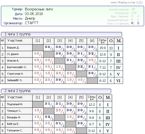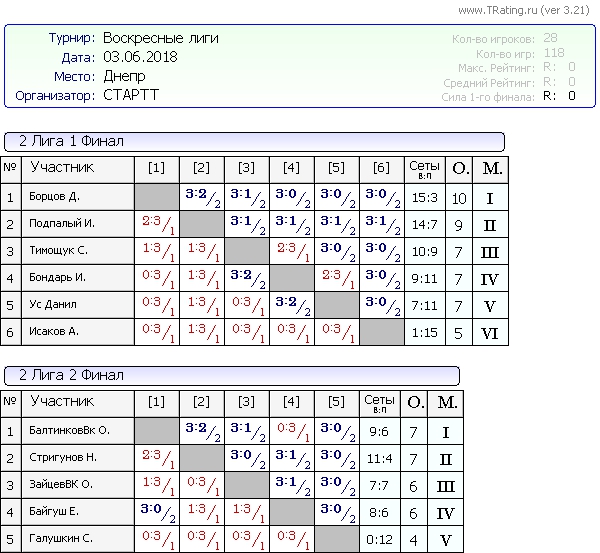 Результаты Воскресных лиг от 03.06.2018г