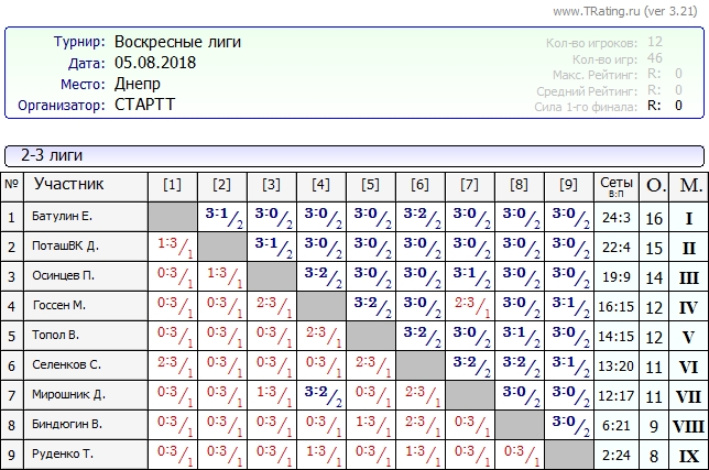 Результаты Воскресных лиг от 05.08.2018г