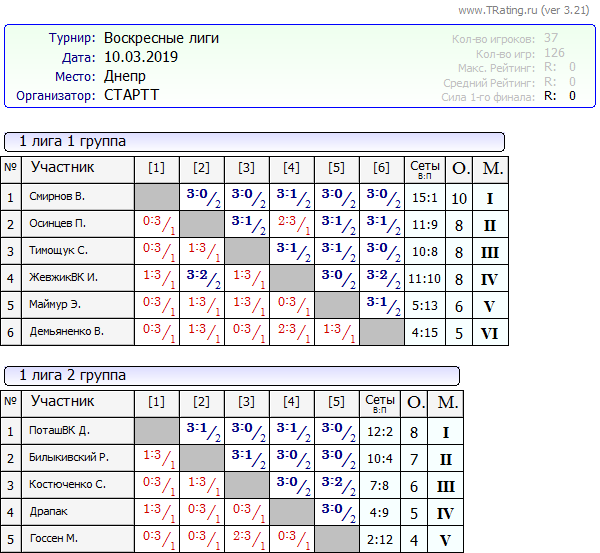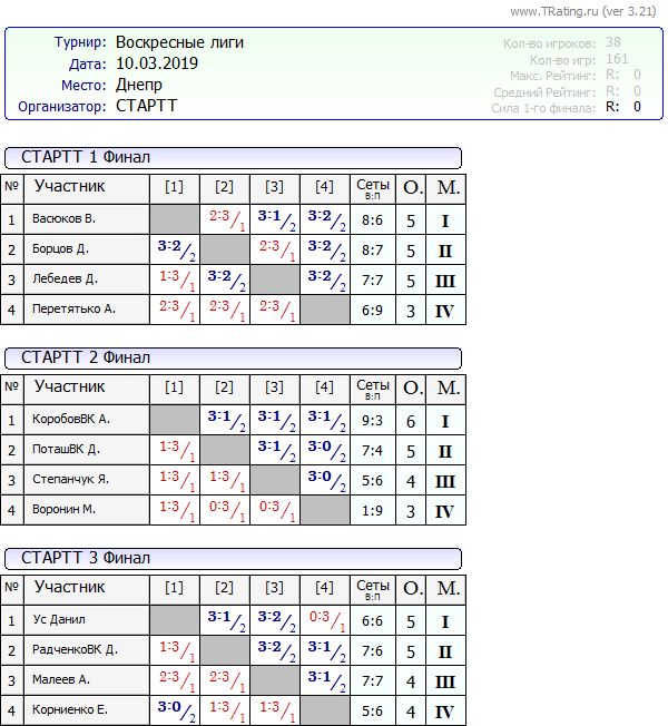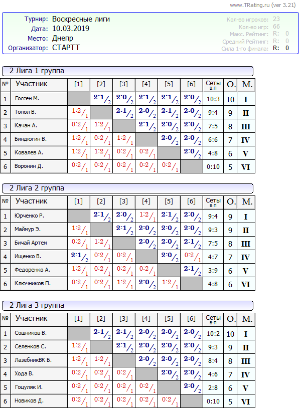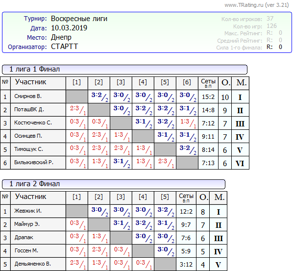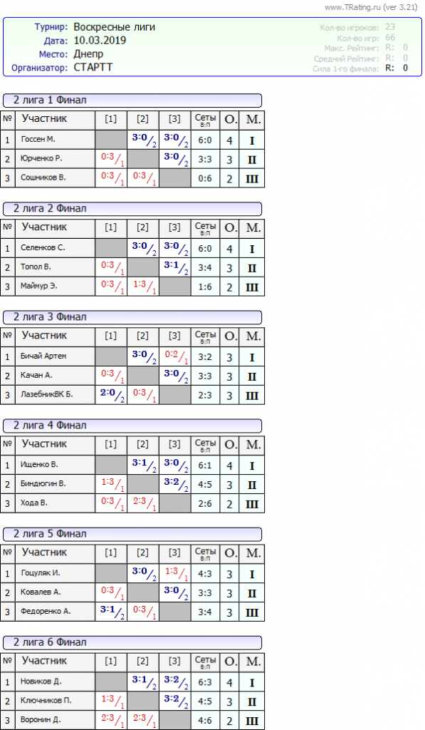 Результаты Воскресных лиг от 10.03.2019г