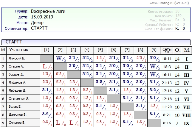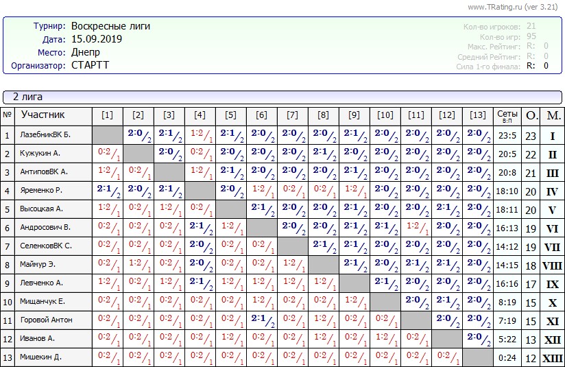 Результаты Воскресных лиг от 15.09.2019г
