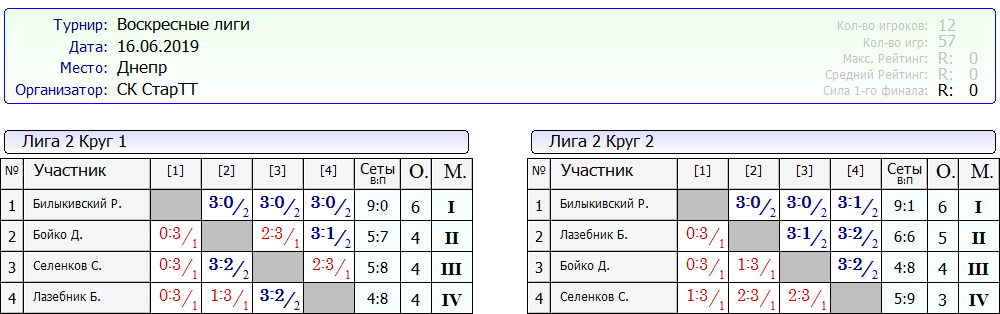 Результаты Воскресных лиг от 16.06.2019г