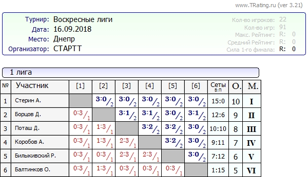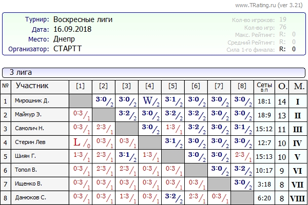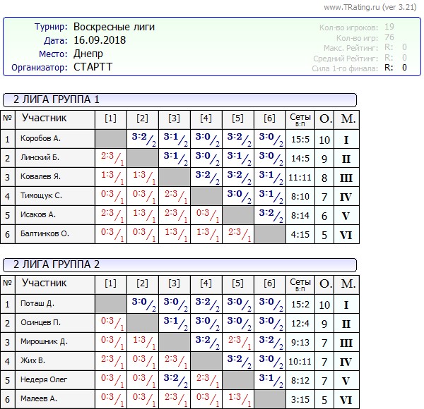 Результаты Воскресных лиг от 16.09.2018г