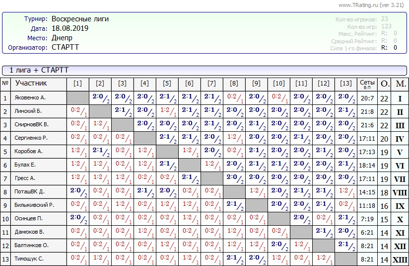 Результаты Воскресных лиг от 18.08.2019г