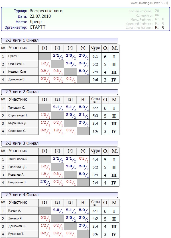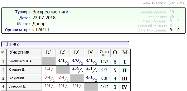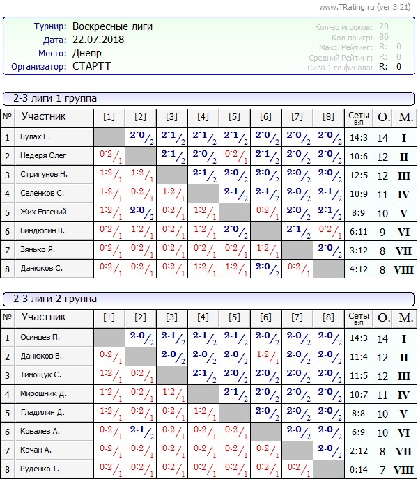 Результаты Воскресных лиг от 22.07.2018г
