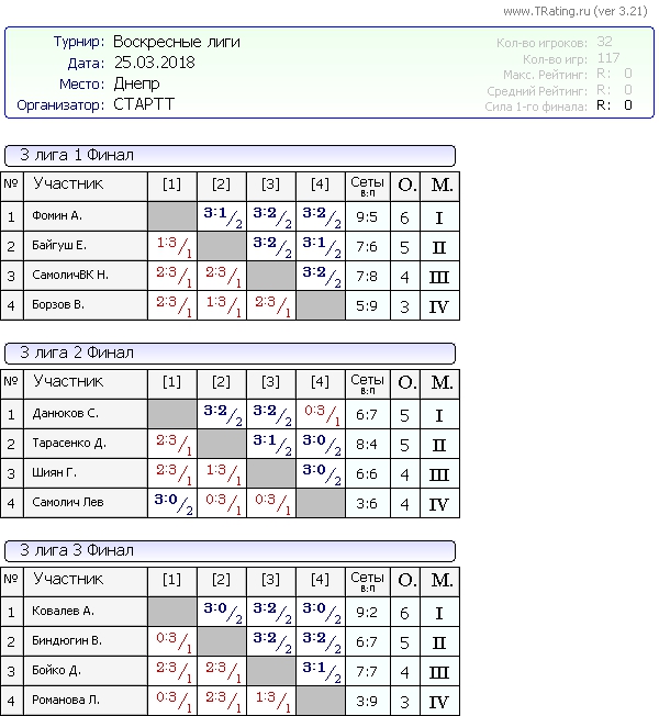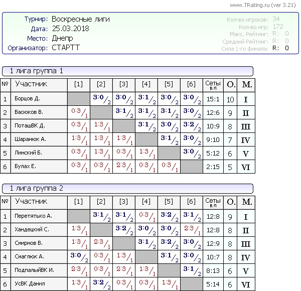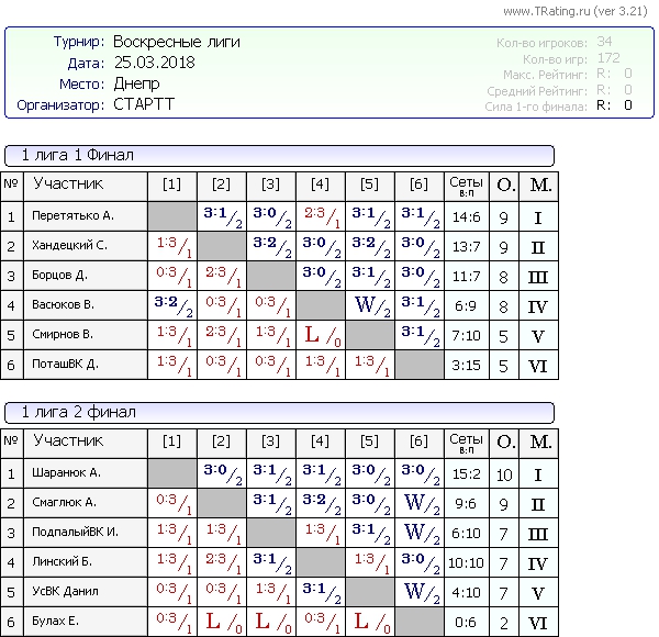 Результаты Воскресных лиг от 25.03.2018г