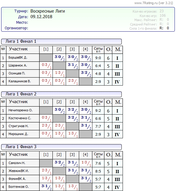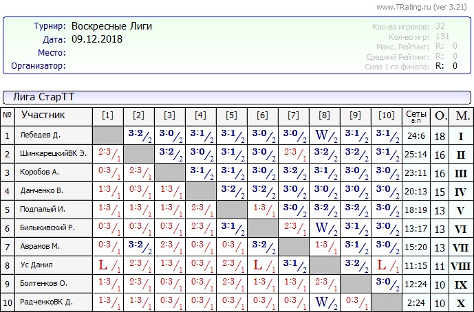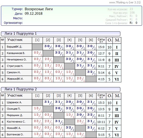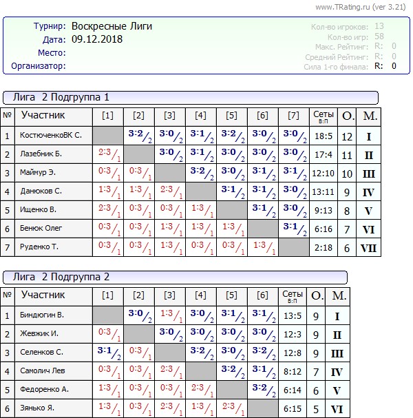 Результаты Воскресных лиг от 9.12.2018г