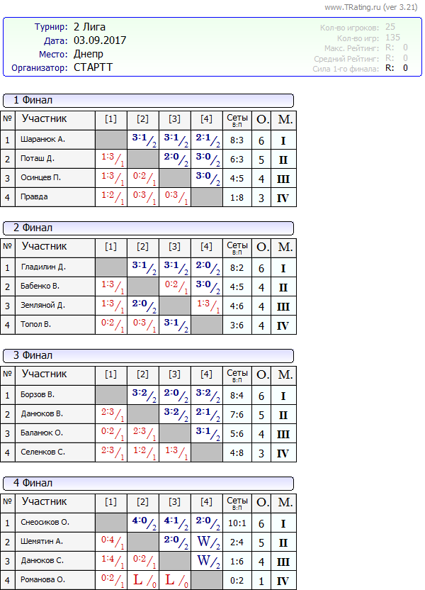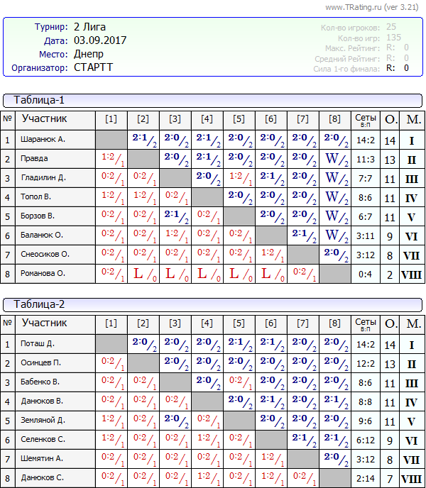 Результаты Воскресных лиг от 03.09.2017г
