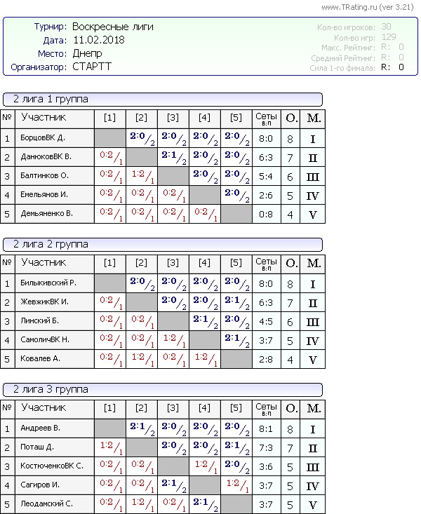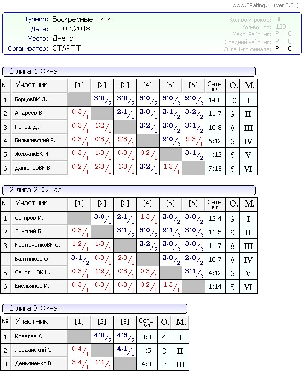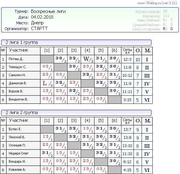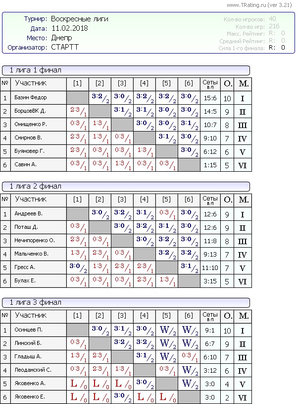Результаты Воскресных лиг от 11.02.2018г