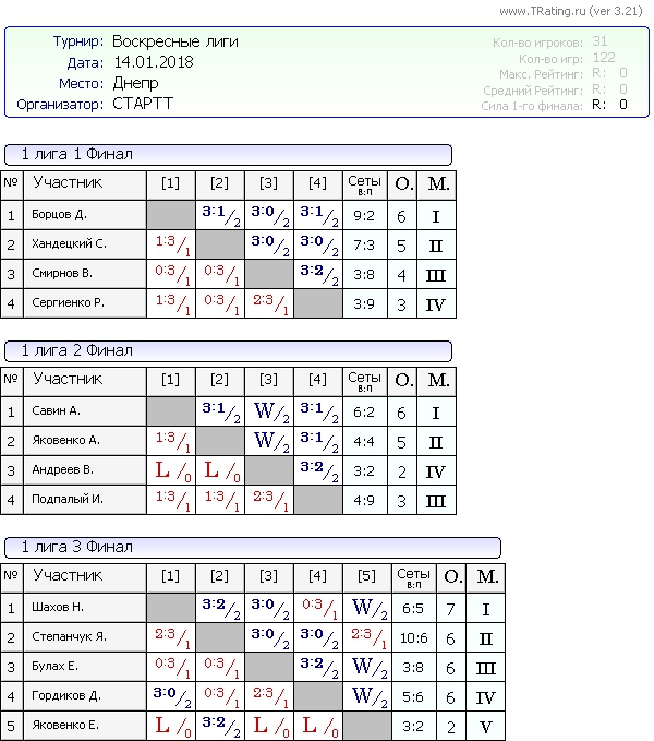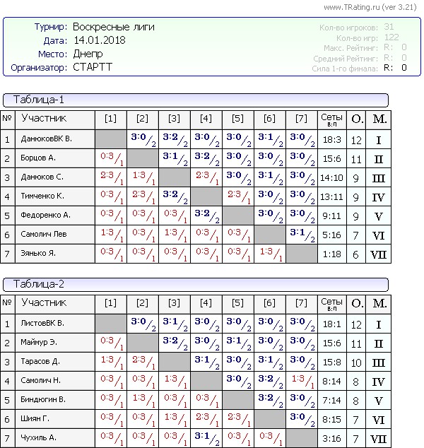 Результаты Воскресных лиг от 14.01.2018г