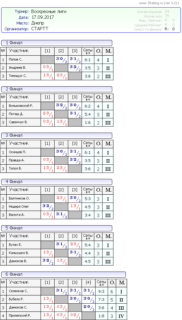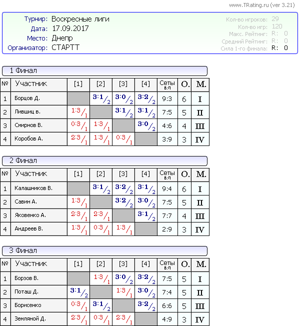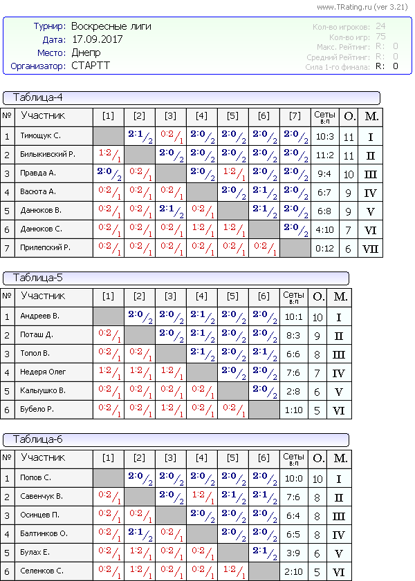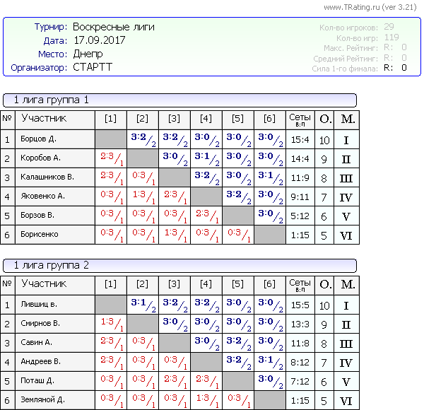 Результаты Воскресных лиг от 17.09.2017г