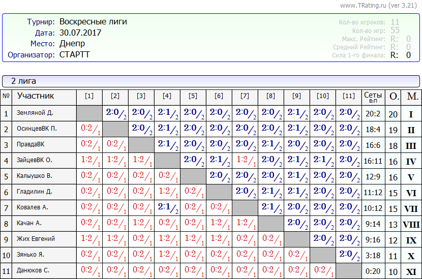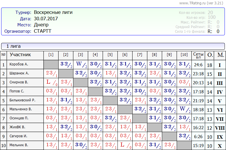 Результаты Воскресных лиг от 30.07.2017г